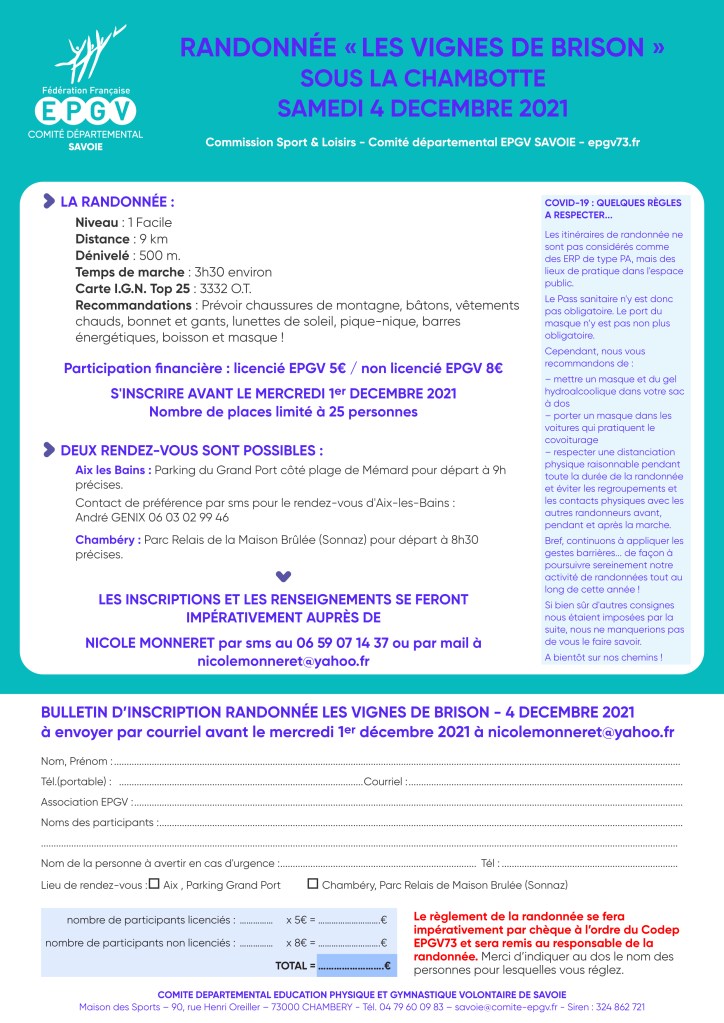La commission Sports et Loisirs du CODEP EPGV73 est heureuse de vous proposer une nouvelle randonnée, le samedi 4 décembre : la randonnée des Vignes de Brison, sous la Chambotte.