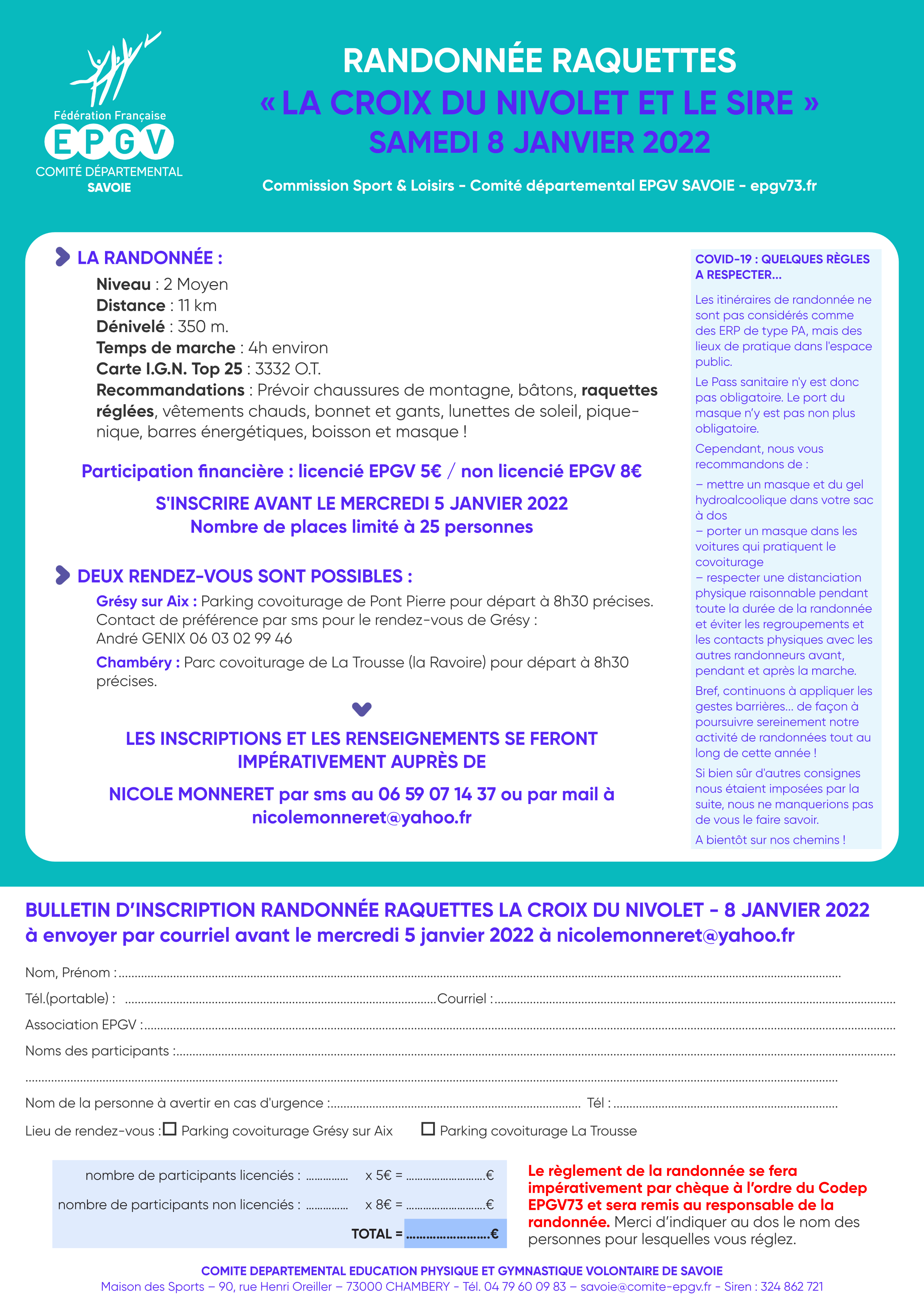 Pour la première de l’année 2022, la commission Sports et Loisirs du CODEP EPGV73 vous propose cette fois une randonnée en raquettes, le samedi 8 janvier. Nous vous emmenons pour l’occasion à la Croix du Nivolet pour admirer le panorama sur le bassin chambérien !