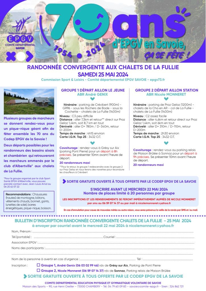*Pour le groupe organisé par le club Sport Santé EPGV d’Albertville, vous pouvez prendre contact avec Jean-Louis Arnol au 06 25 62 07 22