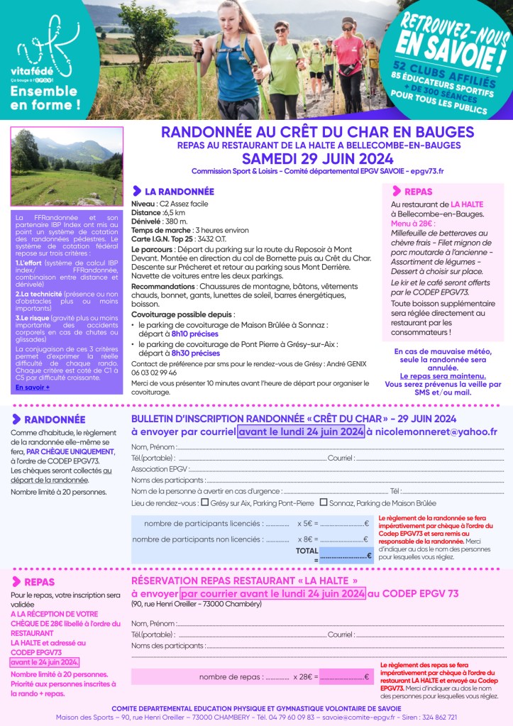 Les bulletins d’inscription (randonnée et/ou repas) sont à renvoyer impérativement avant le lundi 24 juin 2024