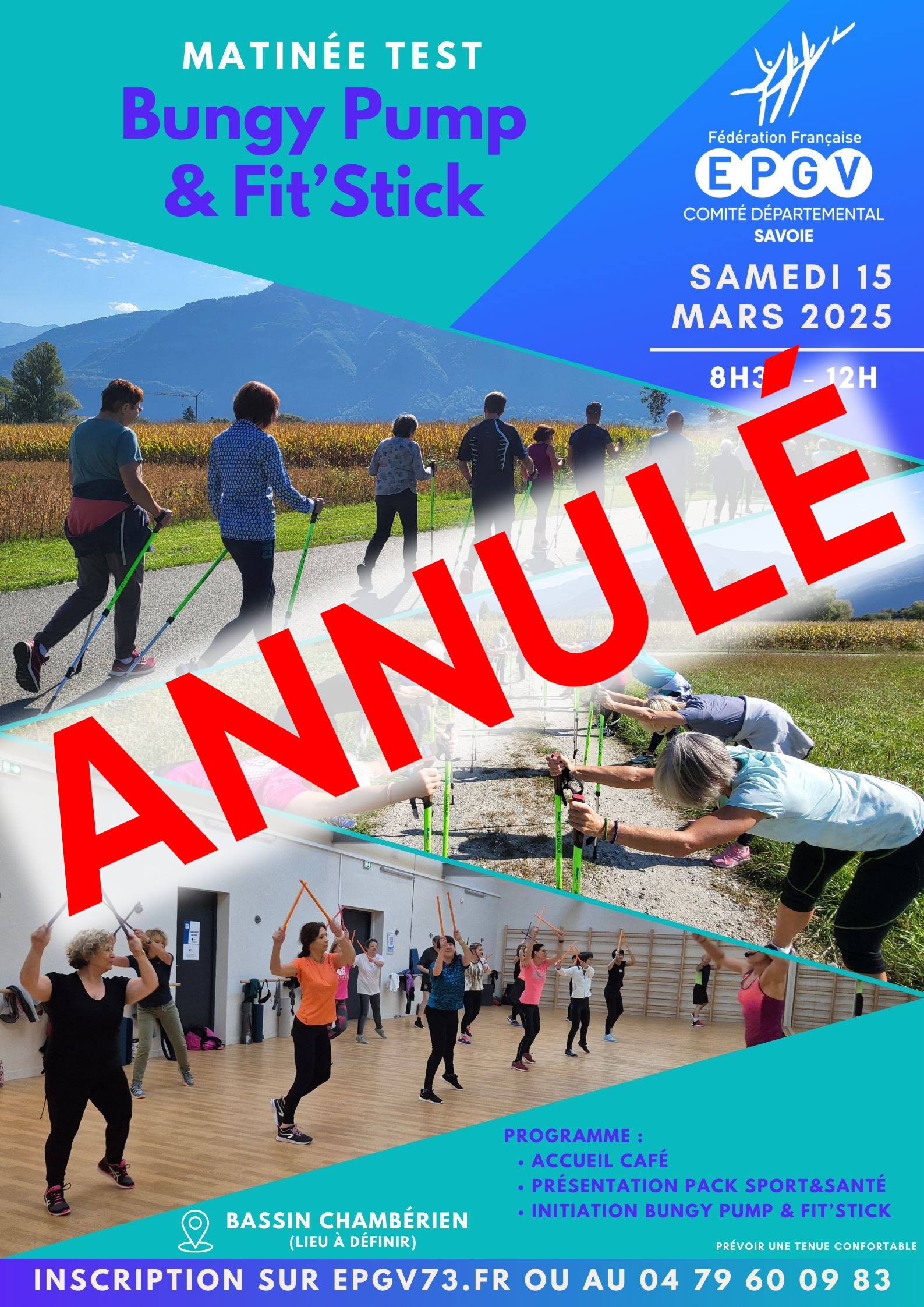 Compte tenu du faible nombre d’inscrits, nous sommes contraints d’annuler à notre matinée de découverte Bungy Pump & Fit Stick, prévue le 15 mars prochain.